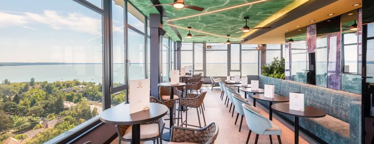 Az étterem egy modern, kortárs étterem, ami ínycsiklandozó, a mai étkezési igényeket maradéktalanul kielégítő, ellenállhatatlan büfékínálata mellett, trendi a'la carte fogásokkal várja vendégeit. Az exkluzív Skyrose Bar nemcsak elegáns megjelenésével, de egyedülálló balatoni körpanorámájával nyűgözi le vendégeiket. A Skyrose Bar egy tökéletesen harmonikus, intim helyszín a szálloda tetején. Élvezze a lélegzetelállító kilátást és ne felejtsen el rendelni egyet a koktélkülönlegességek közül.